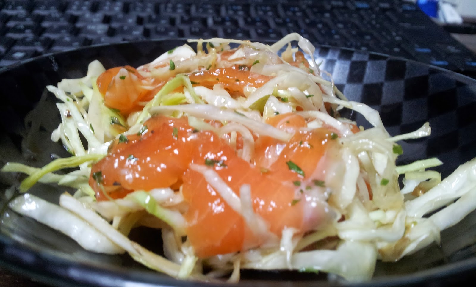 こちらはキャベツの千切りをサーモンと和え、醤油を少しかけて、カッコつけてバジルを振ったりしてみたものです。